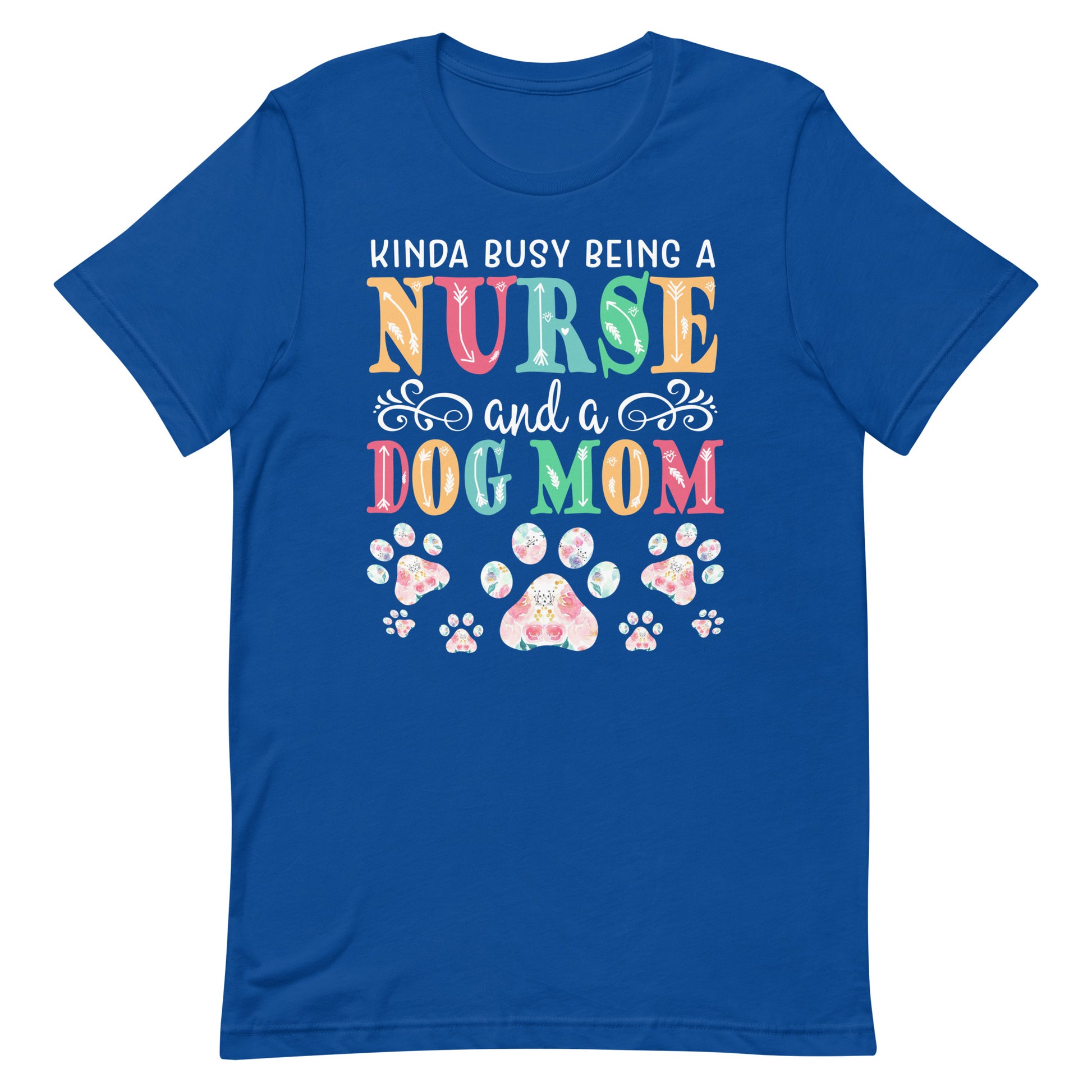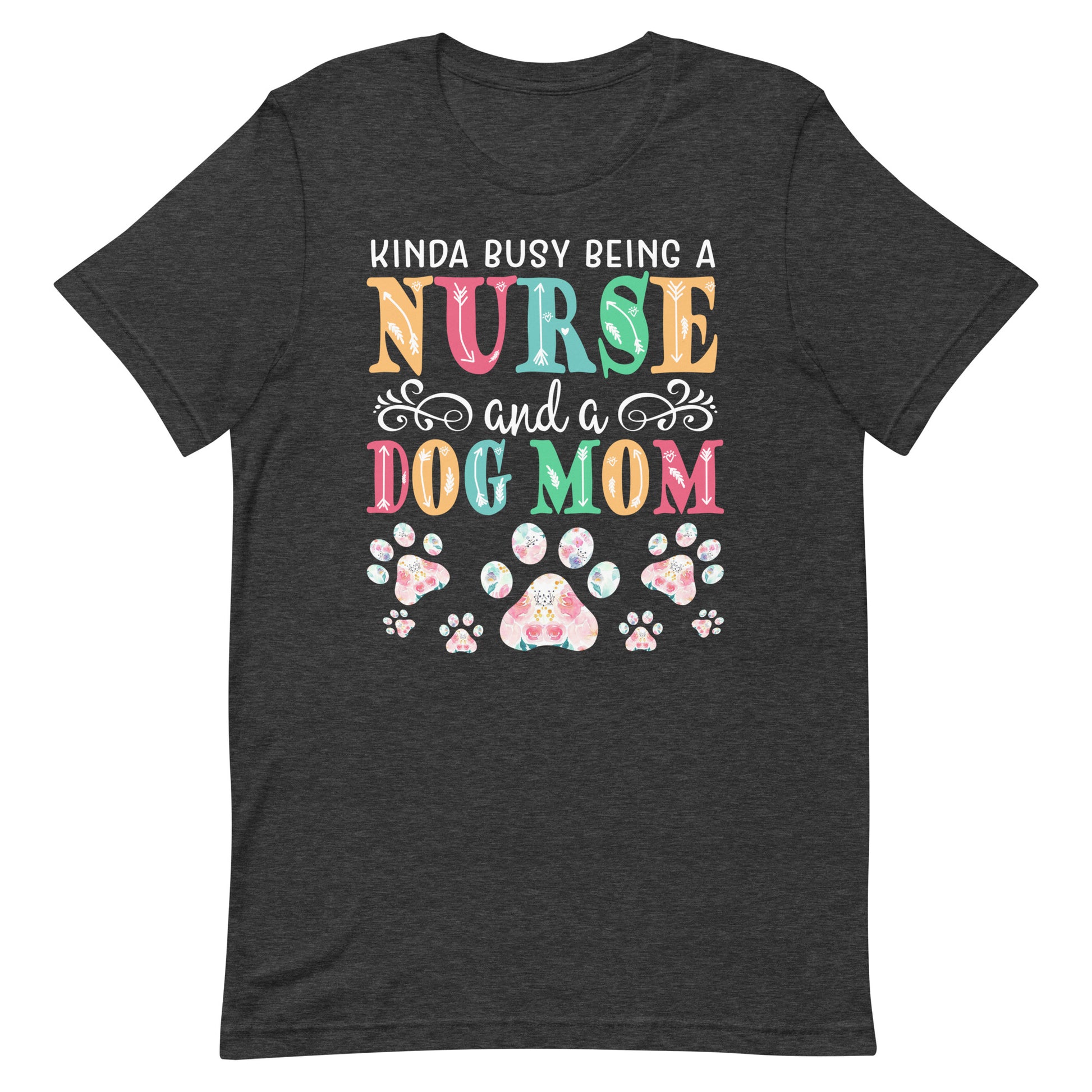Busy Being a Nurse and a Dog Mom Tees are printed in USA