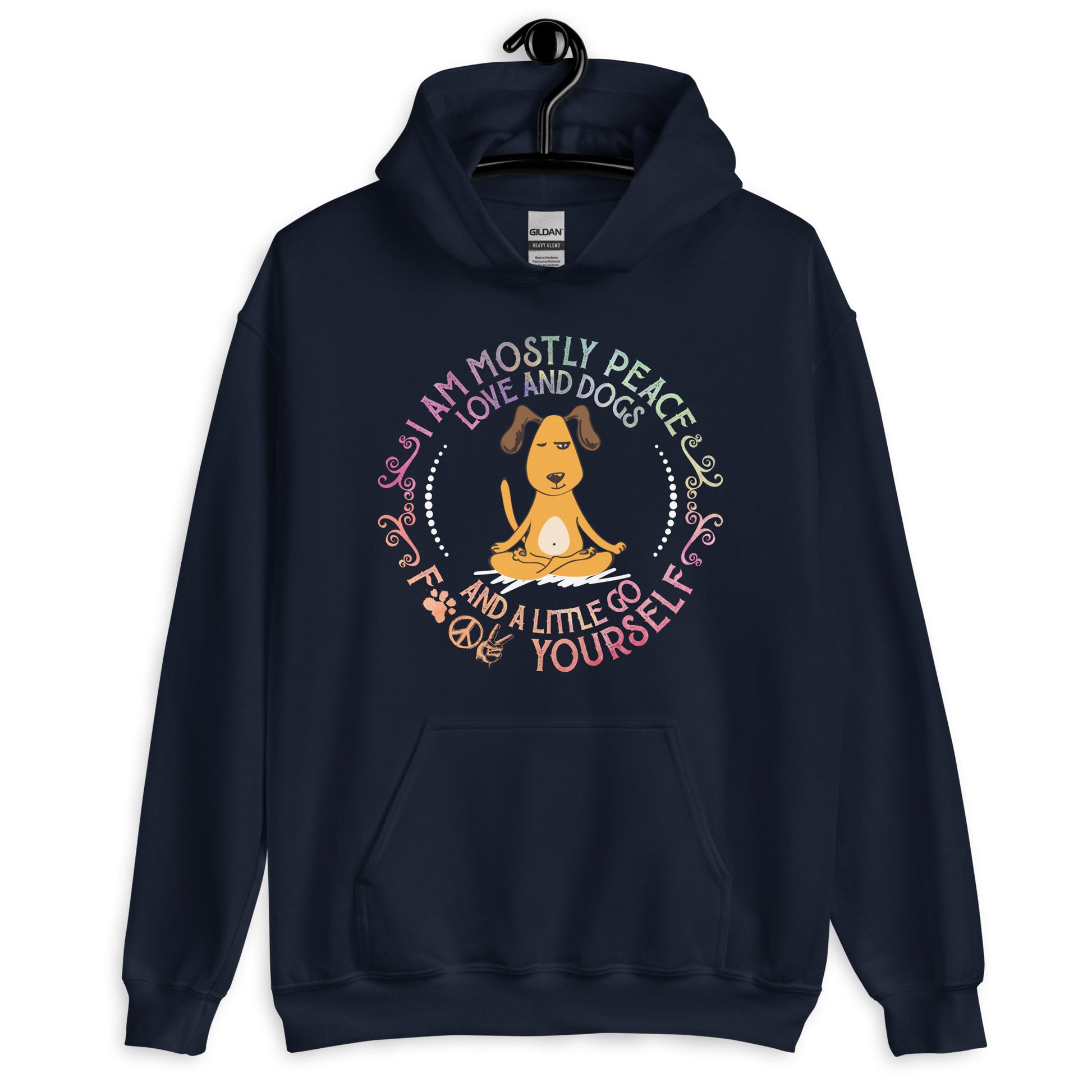 I Am Mostly Peace Love and Dogs Yoga Hoodies are printed in USA