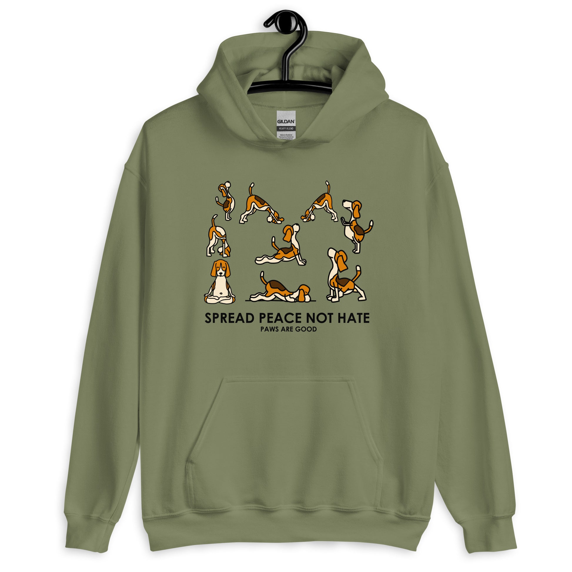 Spread Peace Not Hate Yoga Dogs Unisex Hoodies are printed in USA